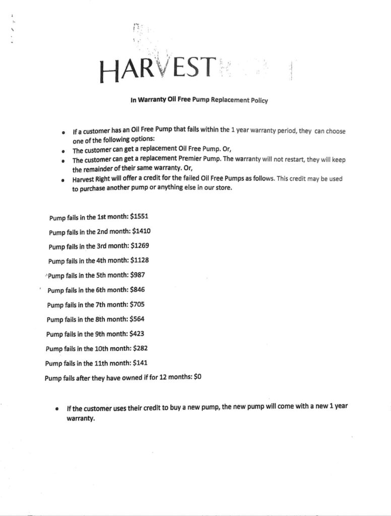 These pumps were manufactured by Scroll Labs technologies out of Chicago and rebranded and sold via Harvest right for one year. These pumps were not designed to handle the moisture vapor and particulate debris from freeze drying and thus had continuous warranty claims submitted to Harvest right. Harvest right could not handle the large influx of warranty claims or the financial implications of the ineffective product they sold so instead what they did was #1. Discontinued the sale of the pump and #2. Began to violate the legal terms and conditions of consumer warranty rights by refusing consumers their full warranty when the pumps broke down and they could not repair or replace them with like kind. Here is a copy of an internal company document sent to their staff;